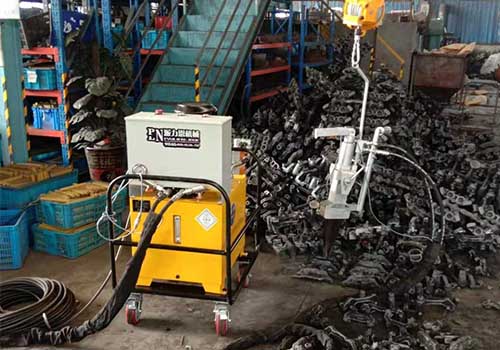 鑄件澆(jiao)冒口分離器工作原理(li):工藝流程(cheng)是:油泵(beng)站接380伏電源,油泵站(zhan)和(he)分離器通過2根高壓油管(一(yi)進一(yi)出)連(lian)接,分離器(qi)由(you)平衡葫蘆吊懸掛方便操(cao)作(zuo)。以下是工作(zuo)原理。鑄件澆冒口(kou)分離器(qi)通過液壓泵站產生(sheng)18-70MPa液(ye)壓(ya)(ya)動力。開(kai)機時,按下(xia)鑄件分離器(qi)手把(ba)開(kai)關(guan),油(you)泵站由低壓(ya)(ya)泵送油(you),當壓(ya)(ya)力達到18MPa,高(gao)(gao)低壓切(qie)換(huan)閥(fa)切(qie)斷低壓泵,這時,由高(gao)(gao)壓柱塞泵工作送油,高(gao)(gao)壓柱塞泵產生(sheng)大(da)70Mpa工作壓(ya)(ya)(ya)力(li)(高(gao)低壓(ya)(ya)(ya)切換原理就是低壓(ya)(ya)(ya)泵快速送大(da)(da)量的油(you)(you),而高(gao)壓(ya)(ya)(ya)柱塞泵是少量油(you)(you)產生高(gao)壓(ya)(ya)(ya),大(da)(da)程度防(fang)止(zhi)(zhi)大(da)(da)量油(you)(you)進出,防(fang)止(zhi)(zhi)油(you)(you)泵站升溫),油(you)(you)管內高(gao)壓(ya)(ya)(ya)油(you)(you)推動分離(li)器(qi)油(you)(you)缸(gang)內活(huo)塞,活(huo)塞推動前端尖鐵,尖鐵向兩(liang)邊推動楔(xie)鐵,以上油(you)(you)壓(ya)(ya)(ya)一系列動作產生大(da)(da)噸分離(li)張力(li),將鑄件澆冒口分離(li)器(qi)從(cong)母體分離(li)下來。